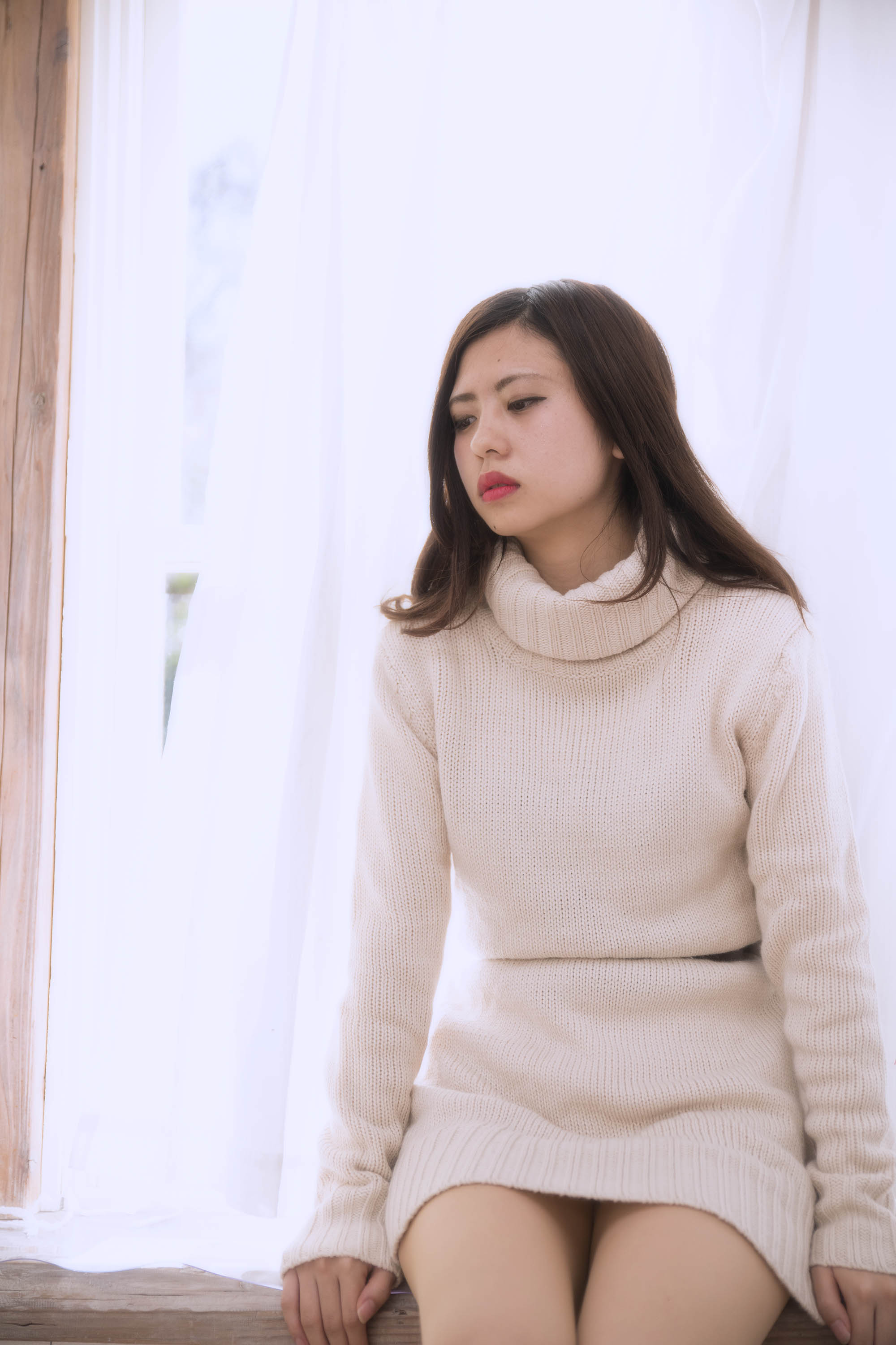 続いて窓際に移動して後ろから日差しを浴びながら、少し物憂い表情や寂しい表情 ( 3-9 )。定番ではありますが、カーテンにくるまって寂しいという感情を出しつつ、カーテンの光の反射でちょっと幻想的に。10-13 は、バラの花を持ってもらって、少し物思いにふけっているようなシーンを。10は、体のS字のラインがよかったのですが、バラの向きがちょっと失敗でした(汗)。